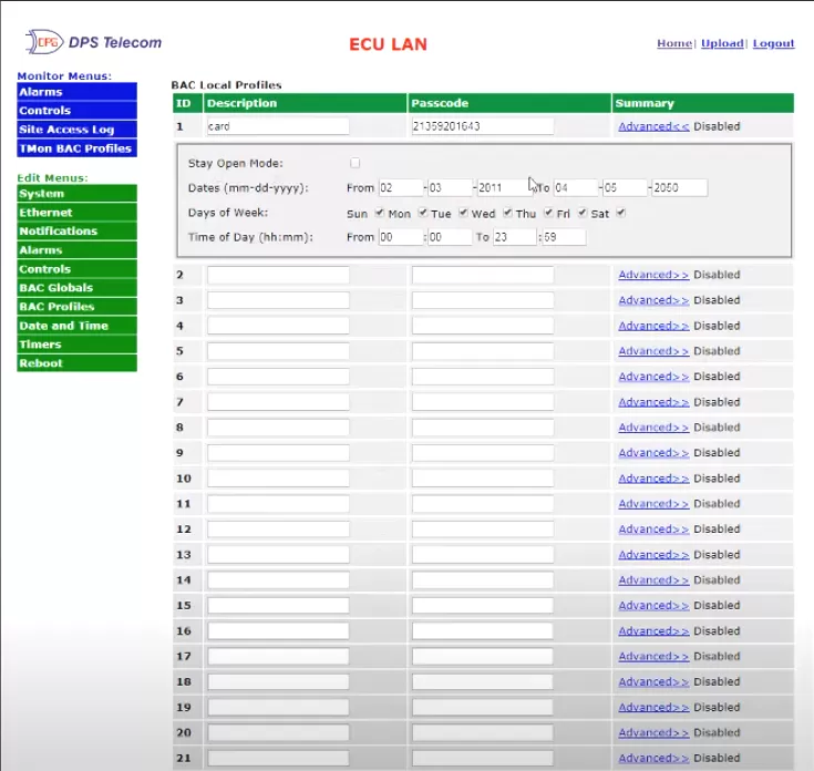 It can operate independently of T/Mon using 32 access profiles databased via the unit's web interface. "Stand-alone" mode is great for turn-up testing, and smaller applications where T/Mon is not involved. The ECU LAN can notify you of unauthorized access via email as well, so if a break-in were to occur, you would know about it and be able to take the appropriate action immediately.