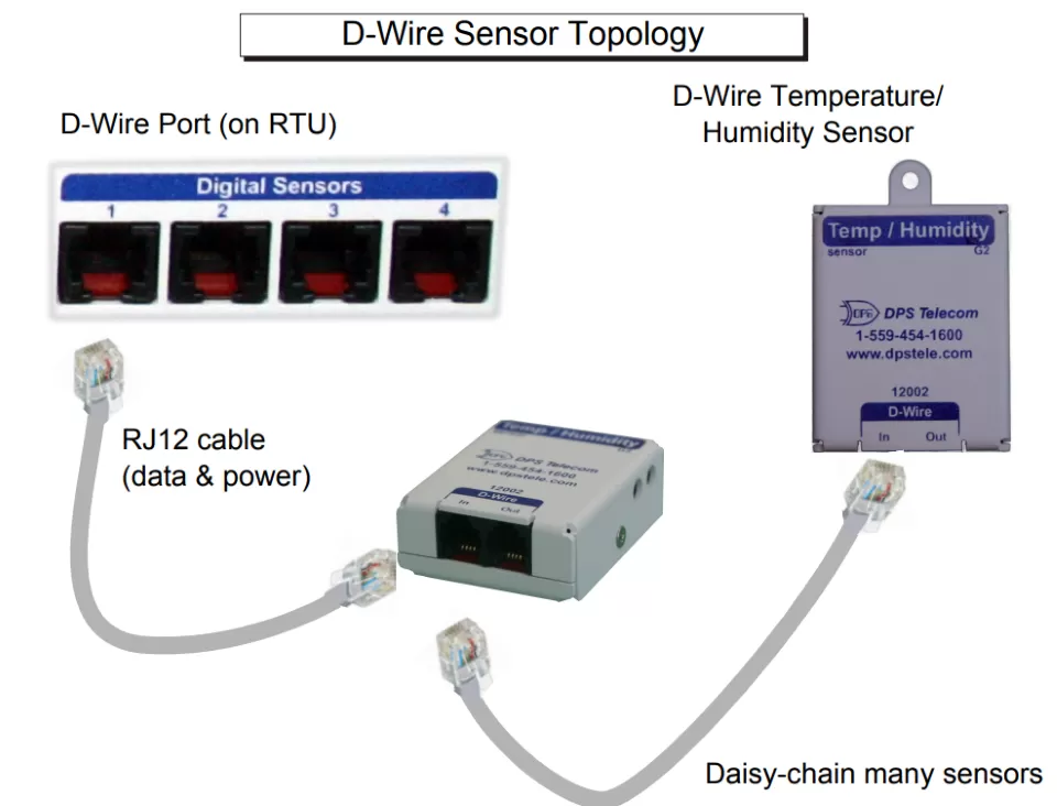 Our D-Wire sensors use simple RJ-11 connectors, in and out, and allow you to chain up to 16 sensors to a single D-Wire port. Your sensor chain can be a maximum of 600 feet, so you can run sensors out as far as you need to monitor your equipment, without having to place analog-capable RTUs in multiple places.