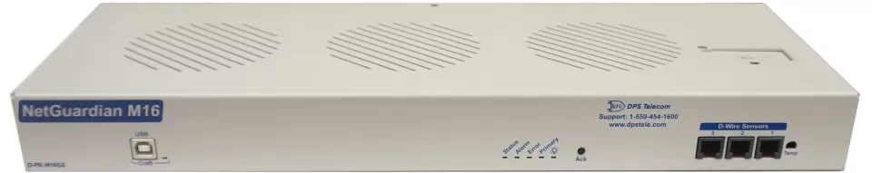 The NetGuardian M16 monitors 16 contact alarm points and reports them to your SNMP manager via LAN. The NetGuardian M16 G2 also has 6 analog inputs, 32 ping targets, and 2 or 18 control relays (depending on build). When used with a DPS master station, the unit also has TRIP dialup backup reporting path for extra reliability in instances that LAN connection is lost or unavailable.